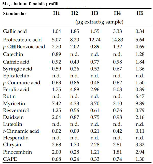 Yakup ve ark., (2019) yaptıkları çalışmada Kırklareli bölgesinden meşe (Querces frainetto) balının polifenolik bileşenlerini HPLC yöntemi ile analiz etmişlerdir. Kalibrasyon grafikleri hazırlamak için on dokuz fenolik standart kullanılmıştır.Yedi fenolik asit (gallik asit, protokateik asit, p-OH benzoik asit, kafeik asit, syringik asit, p-kumarik asit, ferulik asit) ve on iki flavonoid (kateşin, epikateşin, rutin, mirisetin, resveratrol, daidzein, luteolin, t- sinnamik asit, hesperetin, chrysin, pinokembrin, kafeik asit fenilester (CAPE) kullanılmıştır. Epikateşin, rutin, luteolin ve hesperetin dışındaki tüm polifenoller değişen miktarlarda tespit edildi. Protokateik asit, ferulik asit, mirisetin ve chrysin en bol fenolik bileşiklerdi.