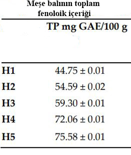 Balın toplam fenolik içeriği 54 ila 88 mg GAE/100g olarak hesaplanmıştır.