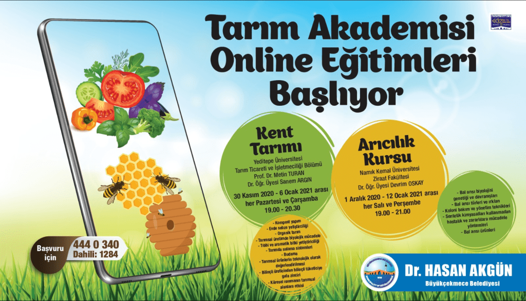 İstanbul ili Büyükçekmece Belediyesi ile Tekirdağ Namık Kemal Üniversitesi arasında imzalanan protokol kapsamında, online Bal Arıları ve Arıcılık eğitimi Dr.Öğr.Üyesi Devrim OSKAY’ın eğitmenliğinde başarılı şekilde tamamlanmıştır. Eğitim; Google Meeting üzerinden, 1 Aralık 2020 -12 Ocak 2021 arası her Salı ve Perşembe 19:00-21:00 arasında yapılmıştır. Online eğitimden 30 kişi faydalanmıştır.